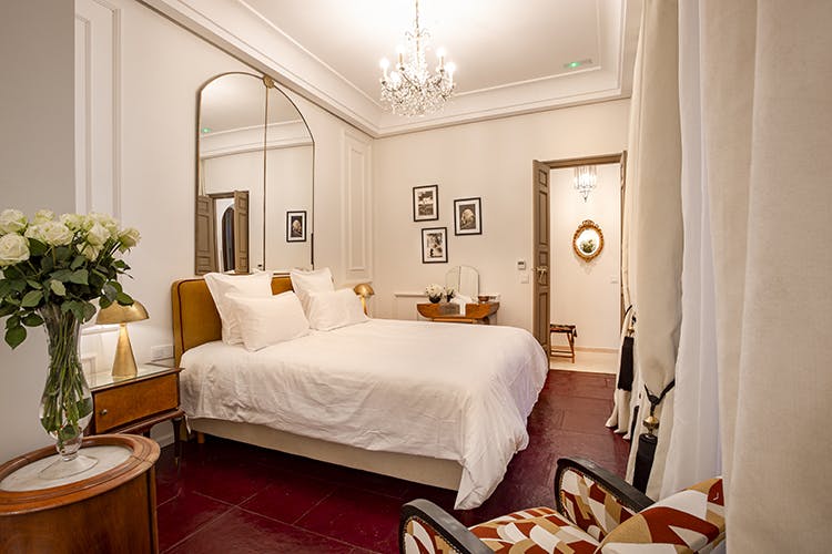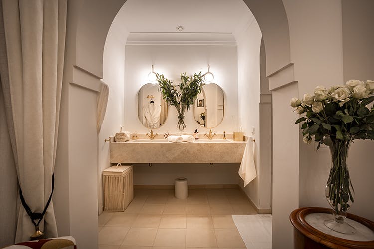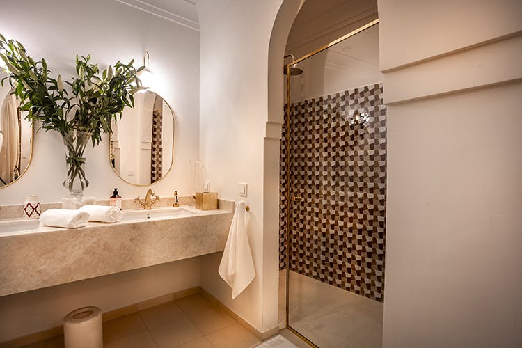 “Nour” (نور) means light. Subtly blending Moroccan tradition and modernity, the “Nour” room offers 23 square meters of refined comfort. Located on the first floor of the riad, it features a king-size bed, a bathroom with a shower open to the bedroom, and a separate toilet. Enhanced by wall moldings, “Nour” combines the elegance of leather with a palette of chic beige tones. Every detail, from the softness of the materials to the overall design, creates an atmosphere that is both sophisticated and enveloping—a tribute to the Moroccan art of living.