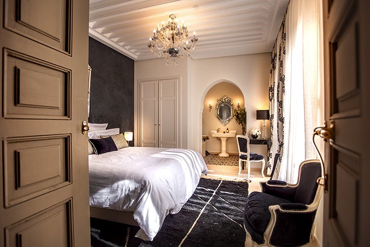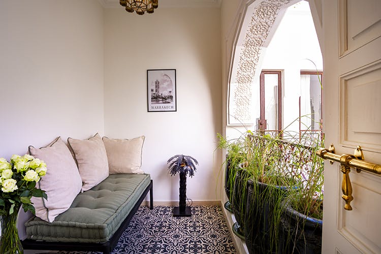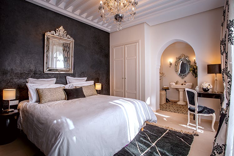 “Zine” (زين) means Beautiful, Elegant. Subtly combining Moroccan tradition and modernity, the “Zine” room offers 25 square meters of refined comfort. Located on the first floor of the riad, it features either two twin beds or a king-size bed, a bathroom with a bathtub open to the bedroom, a separate toilet, and a private terrace overlooking the patio and the centuries-old olive tree. “Zine” immerses you in an atmosphere where the charm of Morocco meets the clean lines of Art Deco.